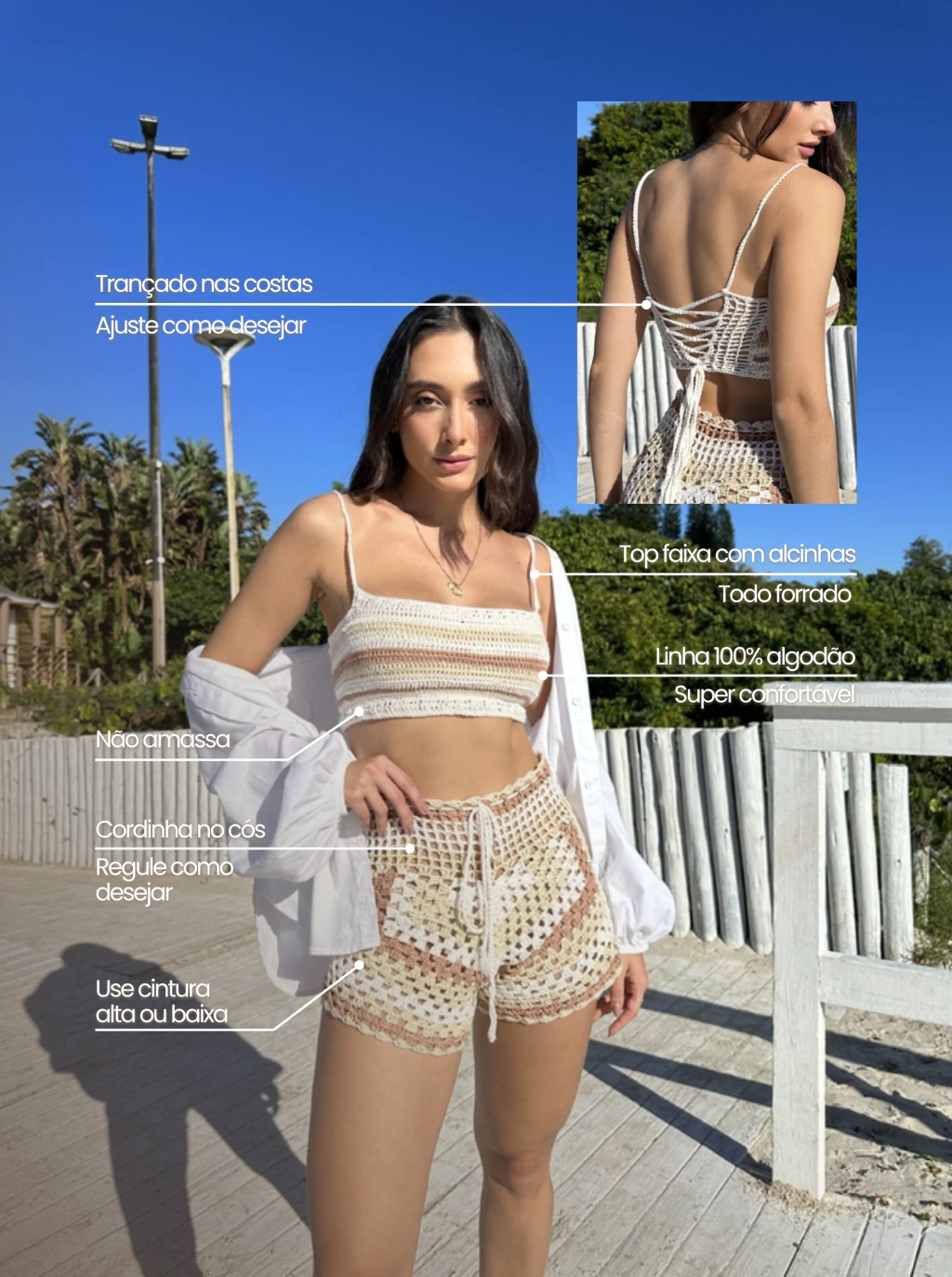 - Detalhes: o short não acompanha forro, mas caso desejar vendemos separadamente. O short forrinho é uma ótima opção para você que deseja aproveitar o look além da praia. São peças confortáveis, e além disso são perfeitas para levar na mala pois não amassam. 100% feito manualmente com todo amor. Caso você deseje adquirir apenas o short em crochê, vendemos separadamente, pesquise em nosso site por "short de crochê". Caso desejar pegar o short em um tamanho e o top em um tamanho diferente é só nos chamar no whatssapp e passar o número do seu pedido para que façamos a alteração de tamanho.