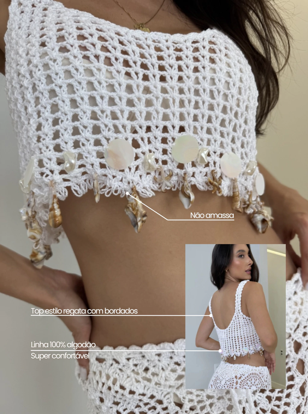 - Modelo: Cropped regata com bordados na parte inferior.