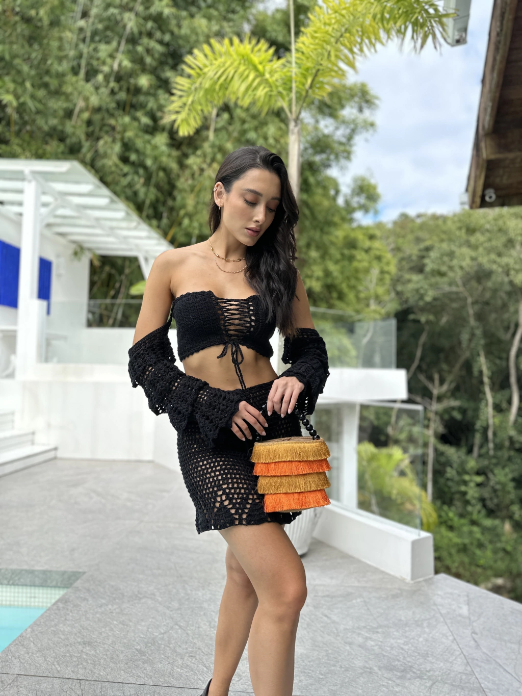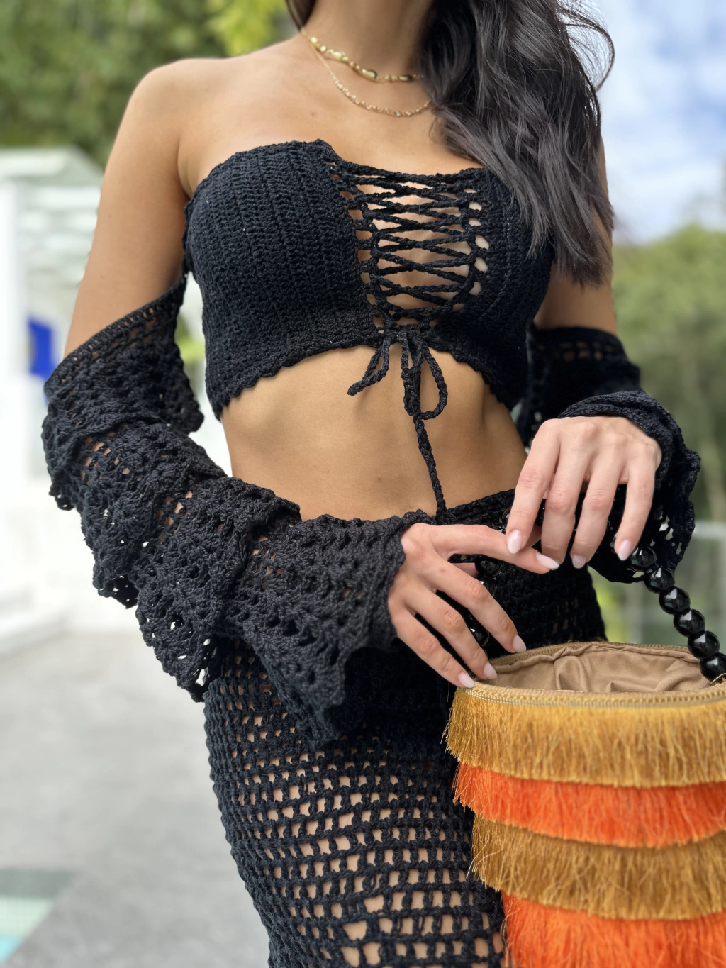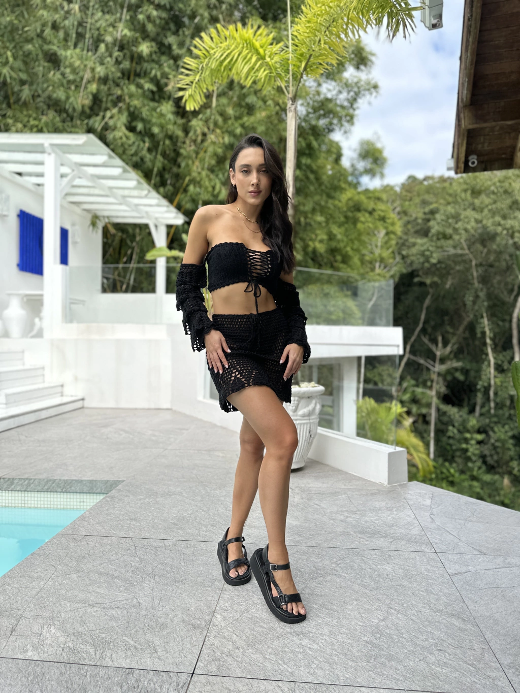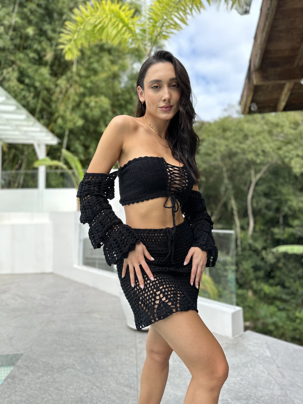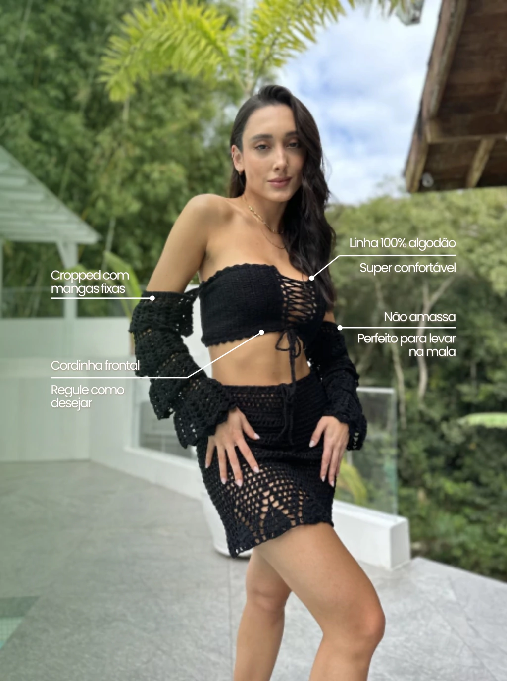 - Modelo: cropped tomara que caia todo forrado. Possui manga longa toda em camadas de babados
