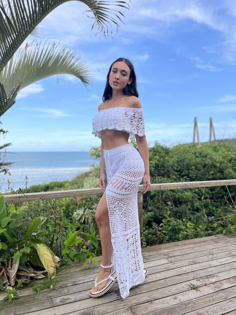 - Modelo: saia longa com fenda lateral. Possui ajuste na cintura, cordinha para amarração;