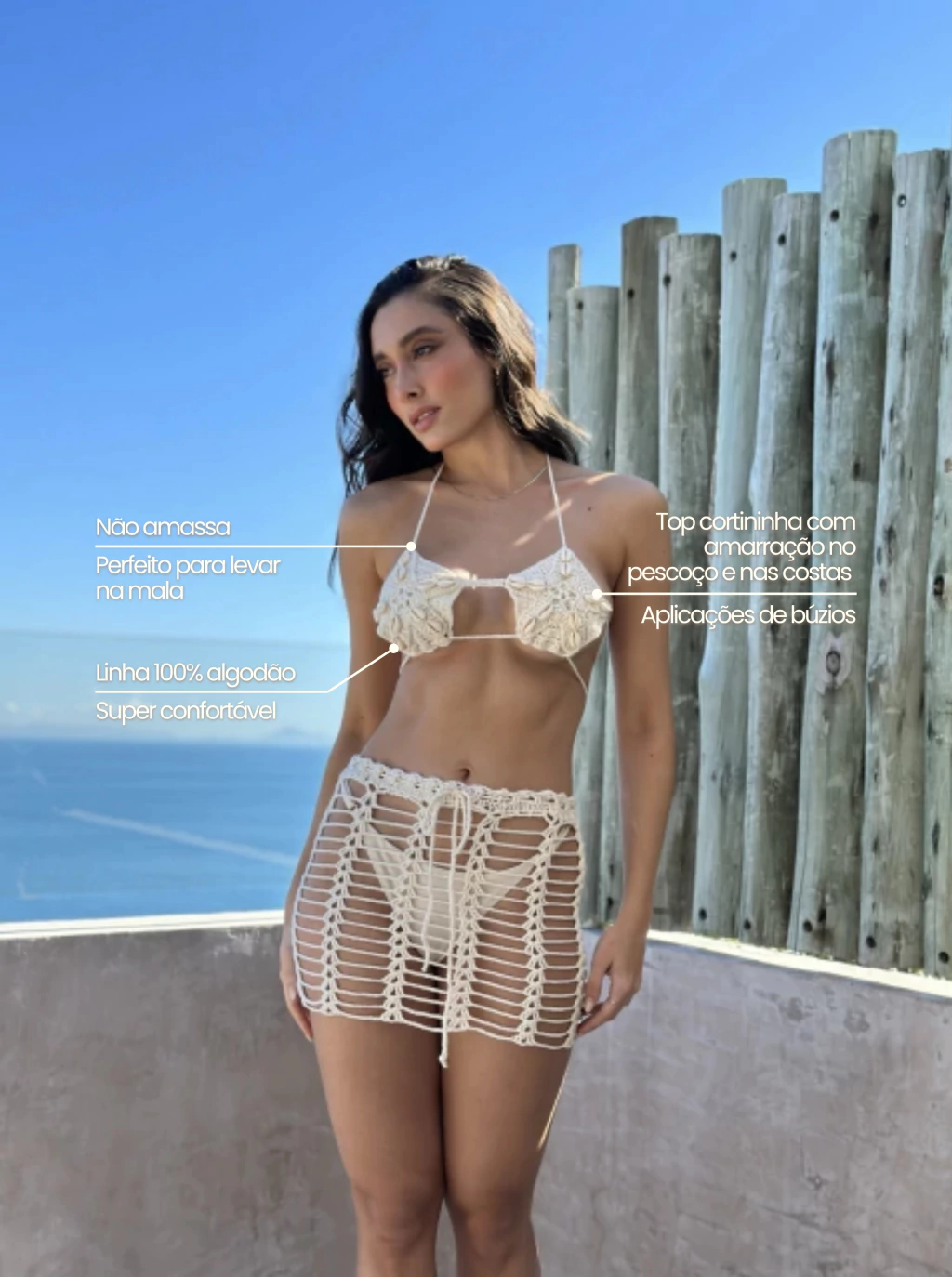 - Modelo: Top cortininha tradicional com amarração no pescoço e nas costas. Com aplicações de buzios no bojo.